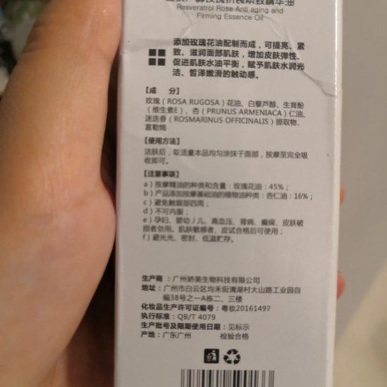 这是唯玫香委托娇美生物公司生产的,现在比相当好,玫瑰花油的成分达到45%,作为一个负配精油,调配的也特别好,涂在皮肤上油油的不到30秒就会吸收干净。还添加了富勒烯,但是排在最后面,也不知道效果,含量能不能达到百分之一。