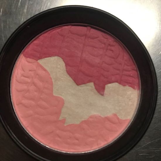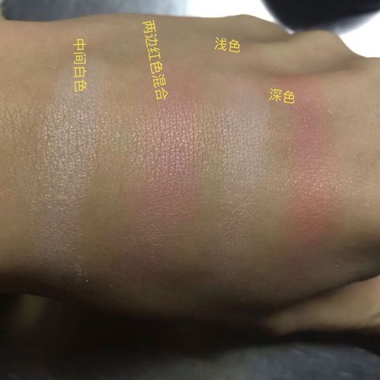 浓重的玫瑰香味,很喜欢。三色混合,浅色看着是阳光偏橙珊瑚粉的色,实际涂着像比粉红色再淡一点的粉,适合白皮。深色看着像梅子红,实际涂出来颜色没有那么惊艳。中间白色带闪,可做高光。略飞粉,人生第一块腮红,会一直留着。
