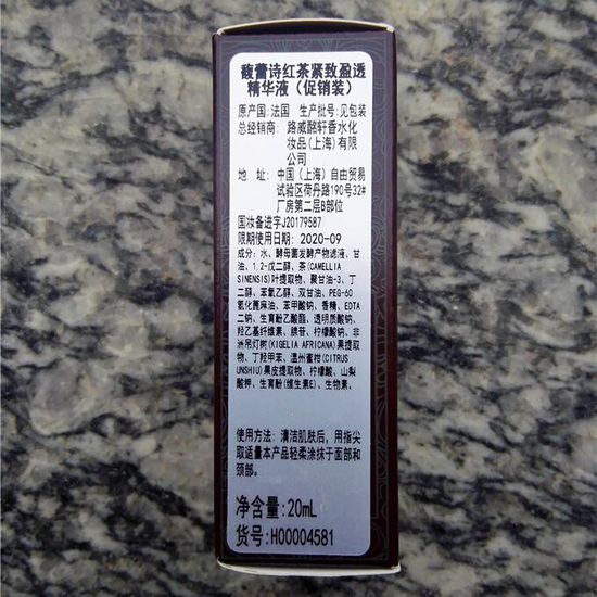 馥蕾诗红茶酵母酵萃精华液:红茶御污浊,抗氧绽年轻 肌肤可能会年岁上升到一定的程度而显得暗沉疲惫,因为肌肤被氧化了;所以熟龄肌肤需要抗氧化。在这里我要分享下我最近很喜欢的排浊净肌、鲜活亮肤的产品:馥蕾诗红茶酵母酵萃精华液。 外观:馥蕾诗红茶酵母酵萃精华液的盒子是深褐色的,盒子前面是像是标签图案设计的集结了品牌名称,产品名称的英文内容。而且盒子都是以一种古典花纹为底的。 盒子后面是英文的内容。 盒子右边也是英文的内容。 盒子的左边是有中文标签,能够看到生产内容和成分等等。 体验装是透明的小瓶子,瓶盖是深褐色的。透过瓶身可以看到馥蕾诗红茶酵母酵萃精华液是清澈的浅茶色液体质地。 瓶身后面还是英文的内容。 产品质地:馥蕾诗红茶酵母酵萃精华液是清澈的浅茶色液体质地,味道淡淡的。流动性很不错;涂抹之后很容易就被肌肤给吸收了。 涂抹馥蕾诗红茶酵母酵萃精华液前后对比: 涂抹前: 涂抹后: 涂抹馥蕾诗红茶酵母酵萃精华液之后,虎口附近肌肤看起来比较细腻了些;也比较有光泽。 使用感受:我很喜欢馥蕾诗红茶系列。馥蕾诗红茶酵母酵萃精华液可以帮助肌肤保持润泽状态。在涂抹馥蕾诗红茶酵母酵萃精华液之后肌肤不会觉得刺激,也没有厚重的感觉;涂抹馥蕾诗红茶酵母酵萃精华液之后肌肤的感觉是变得比较水润柔嫩,光泽感也会变得很不错。使用之后,在之后的时间会觉得肌肤是水油平衡的状态。而且即便是寒冷的冬天,肌肤也不会觉得干燥;能够时刻保持很舒服的肌肤状态,赞! THE END.